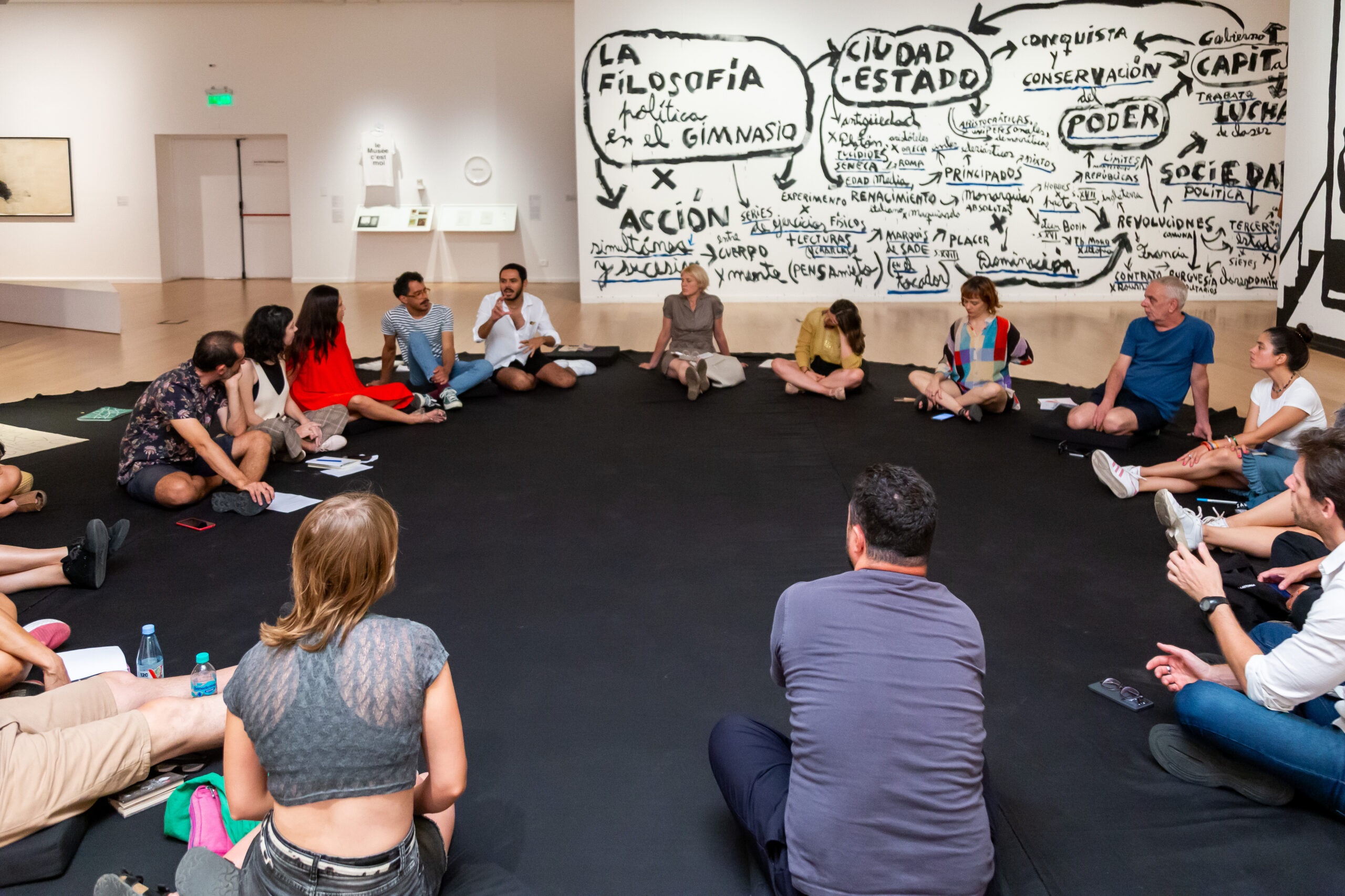 Como despedida de la exposición El aprendizaje infinito, tras un taller de dibujo con agua coordinado por Claudia del Río, vamos a compartir perspectivas sobre el diálogo entre aprendizaje y creación. La conversación pondrá en escena visiones y experiencias de colectivos y proyectos que, además de participar con sus obras en la exposición, han sido parte de distintos programas educativos del Museo Moderno a lo largo de 2024. La propuesta consistirá en reflexionar sobre las situaciones en las que hacer arte puede ser también una forma de hacer sociedad y reparar vínculos con las comunidades y los territorios.
