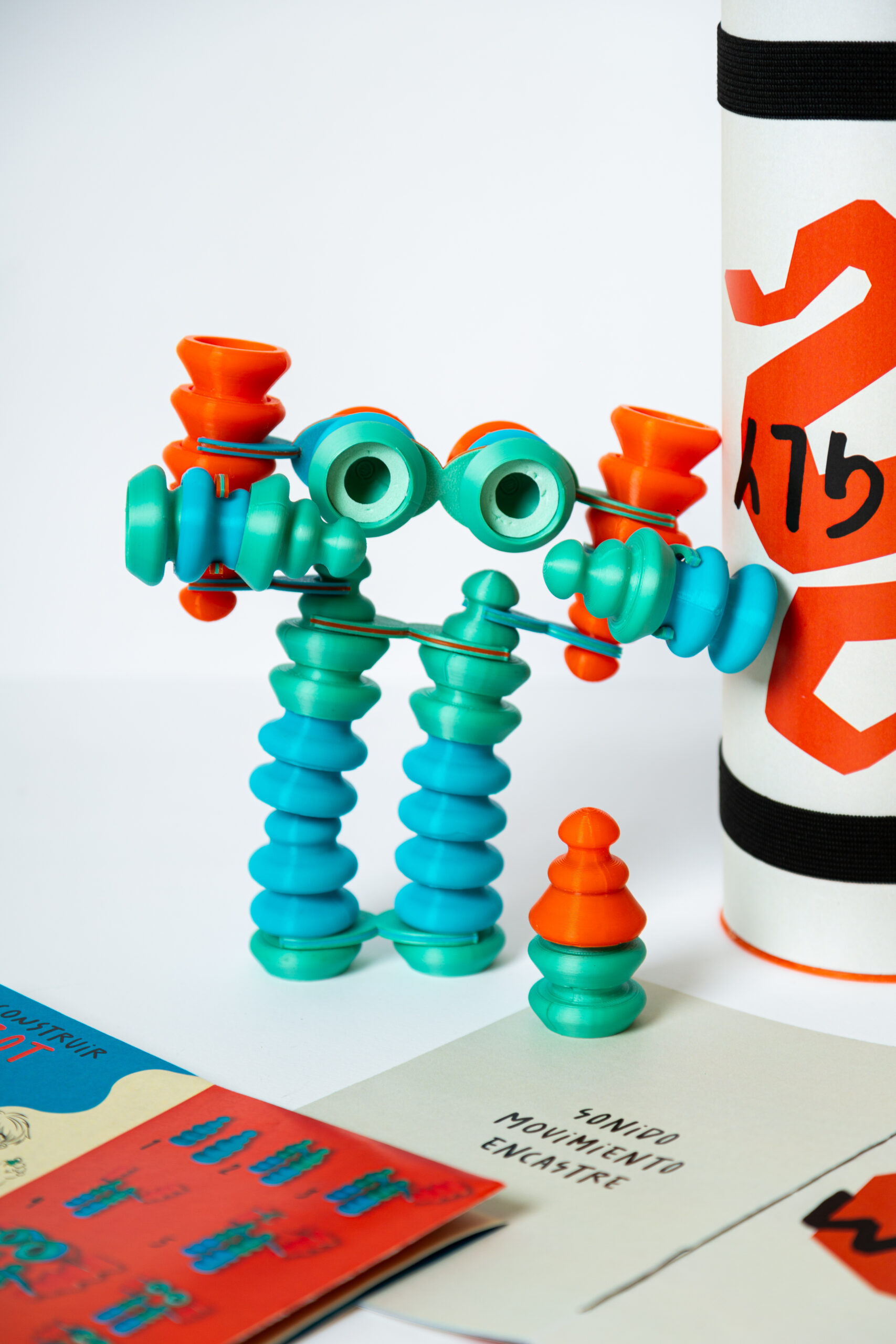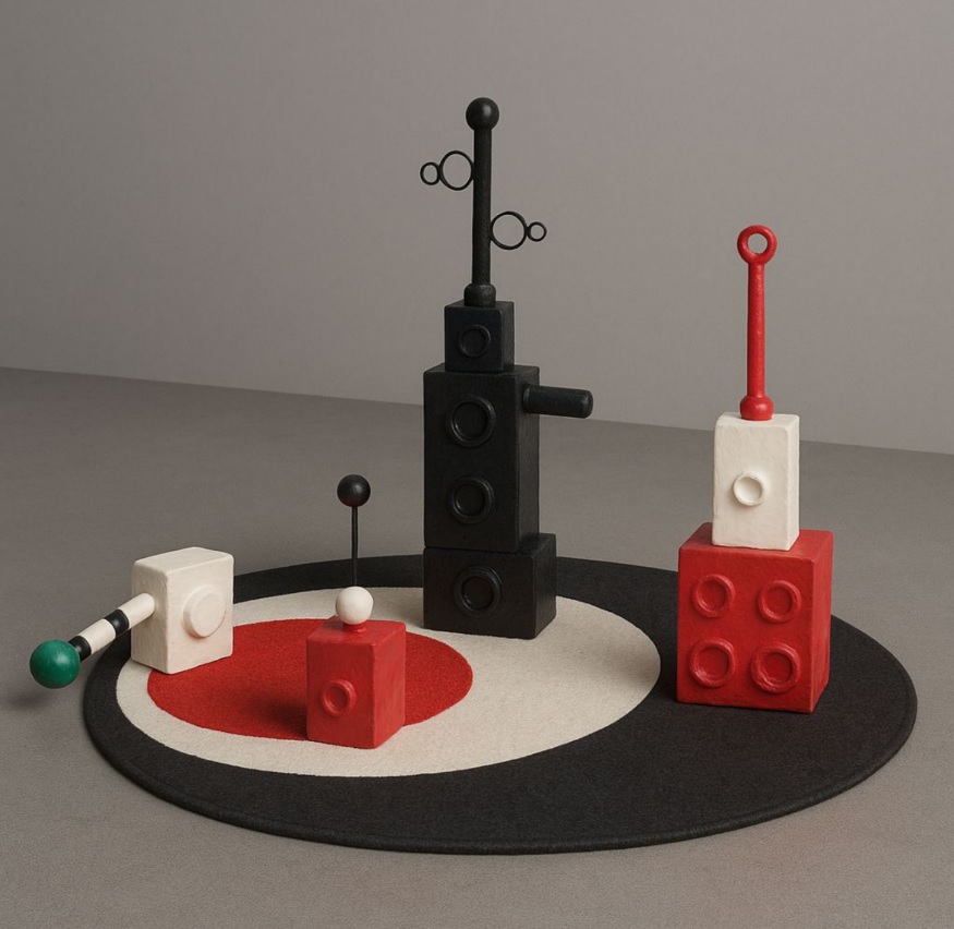 Mitofísica es un espacio de experimentación artística y sensorial que propone un “manual de instrucciones” para que el público asistente realice operaciones simples con un conjunto de piezas de colores primarios y geometría estricta: apilar, encastrar, construir y ensamblar las piezas entre sí.