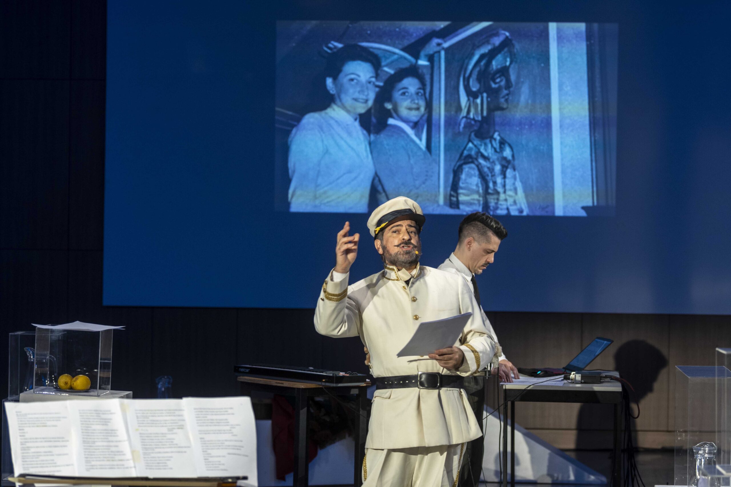 On Thursday 21, Friday 22 and Saturday 23, as part of the Third Edition of the Exposiciones en cartel [Exhibitions on Display] cycle, the museum hosted the premiere of the opera Nada más viejo [Nothing Older], written by the actor and playwright Rafael Spregelburd, with original music and sound design by Zypce. The theatrical experience, which was performed to a full house in the auditorium on all three nights, tells of the legendary foundation of the Museo Moderno. In it, Spregelburd & Zypce portray two folklorists in charge of an evening to celebrate the hundredth anniversary of Rafael Squirru’s birth. For the second act, the audience is taken to the Yapeyú, the ship that sailed the world, touring the 53 works that made up the exhibition Muestra flotante de 50 artistas argentinos [Floating Exhibition of 50 Argentinian Artists]. Spregelburd played the role of the captain and Zypce took on that of a ship’s officer, in this play that puts a fictional twist on the real adventure that led to the founding of the museum, while revisiting the rupture brought about by modern art in the 20th century. The video screen showed the only photos of the ship with the works chosen by Squirru and recorded in the logbook of the voyage that was written by Teresa Baratta, one of the ship’s stewardesses.