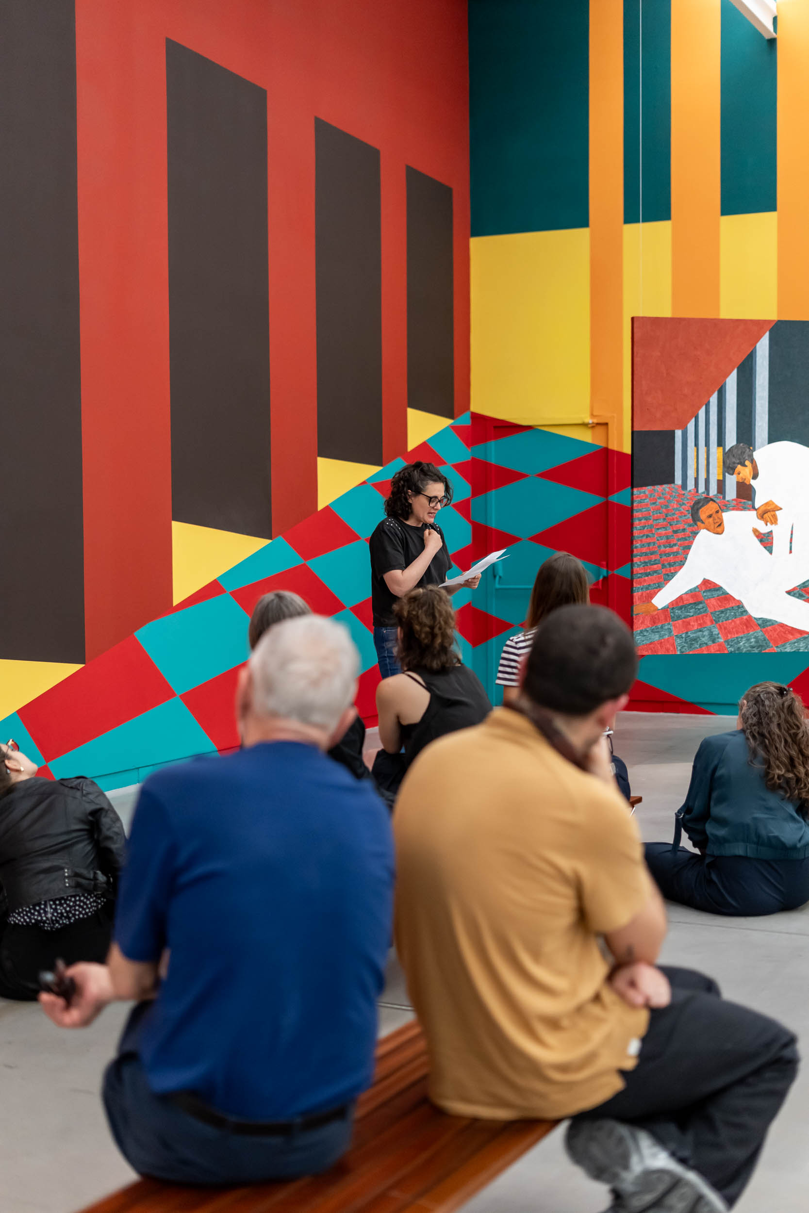 The Public Programmes department organises many activities at the museum but, since 2022, ‘Misguided Visits’ has been putting a new spin on a classic museum activity: the guided tour. On Saturday, 3 August, writer Martín Kohan was invited to lead a visit to the main hall of the exhibition Moderno y MetaModerno [Moderno and MetaModerno]. Kohan began the tour at the entrance to the exhibition with a brief lecture on modernity, before reading eleven of his own unpublished essays on the following artists, each delivered in front of a work by the artist in question: Tomás Maldonado, Guillermo González Ruiz, Oscar Smoje, Juan Pablo Renzi, Kenneth Kemble, Alberto Heredia, Ricardo Carpani, Antonio Berni, and León Ferrari. After listening to his very unique interpretation of the works and their historical circumstances, the audience followed the author of Museo de la revolución [Museum of the Revolution] to the doors of museum’s historical building on San Juan where the Misguided Visit ended with a reflection on the riverside of the city.
