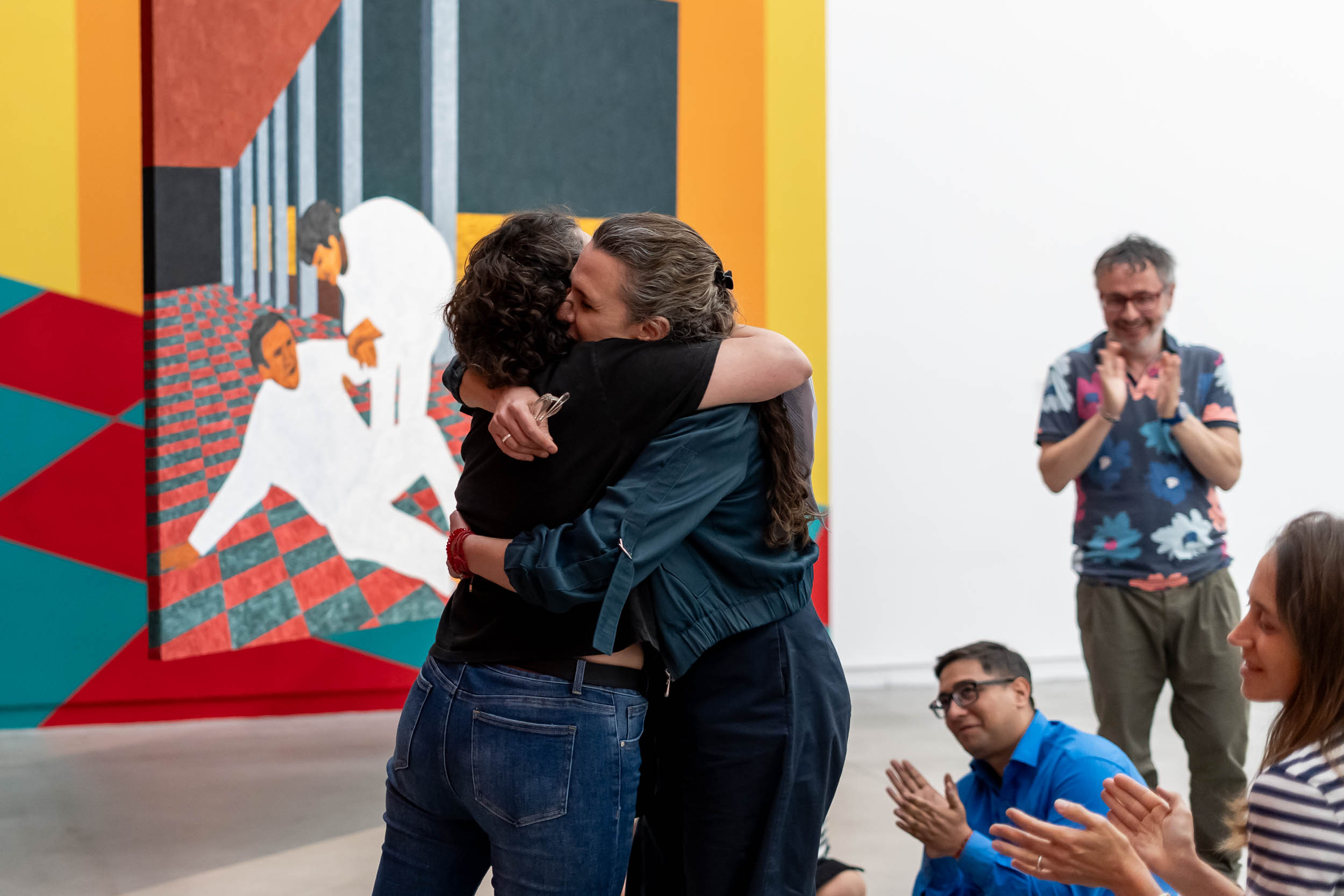 This was followed by Ayelén Coccoz and Antonio Villa, who took to the centre of the auditorium, in an act that bordered on the theatrical. Somewhat in the style of an old television show, the two artists exchanged roles, responded to a questionnaire, and even showed off attributes and objects from their childhoods. To close, standing before Tschopp’s mural, Verónica Gómez spoke as if reading a letter, shedding light on her friend’s aesthetic, whom she embraced at the end of this unusual journey.