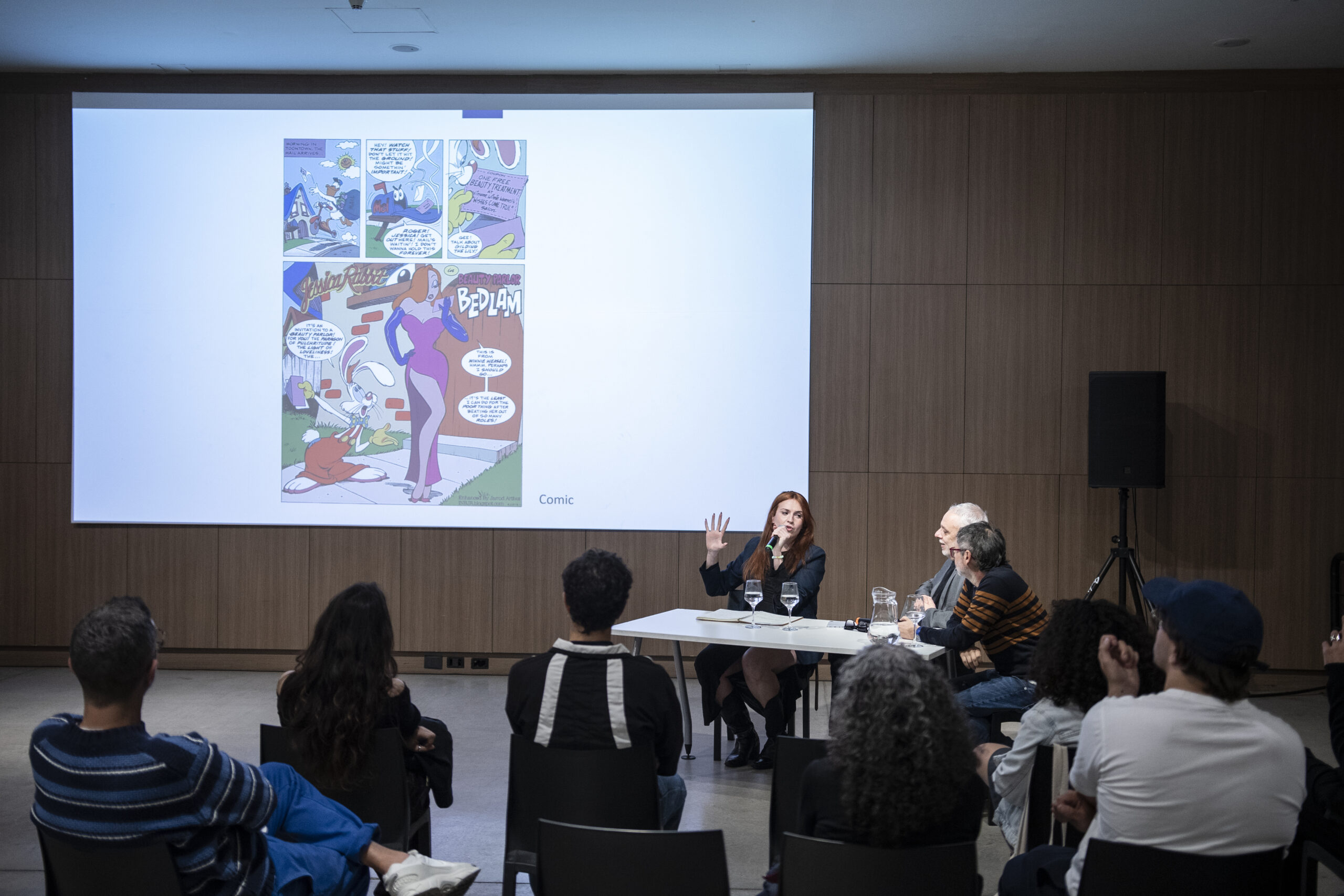 In celebration of Alberto Passolini’s mural painting at the museum Soñar a borbotones [Dreaming in Spurts], on Saturday 10 August, Curator of Public Programmes Fernando García interviewed the artist in the Moderno auditorium, alongside Raúl Flores, curator of the exhibition Dibujar es crear mundos [Drawing to Create Worlds]. The mural stretches from the museum hall all the way to the entrance to the exhibition. It features imagery of Passolini’s own visual education: the artist claims that the only landscapes he encountered during his childhood were those shown on television, rather than in nature. This explains his inclusion of a living room – complete with television set – with images flowing across the auditorium screen as if Passolini had downloaded his visual memories from a USB drive. The images include vintage adverts for products ranging from a lava lamp to automatic washing machines and a Chevy coupe, to scenes from films and television programmes. To close the event, the artist staged a performative raffle full of small ‘prizes’ for the audience members.