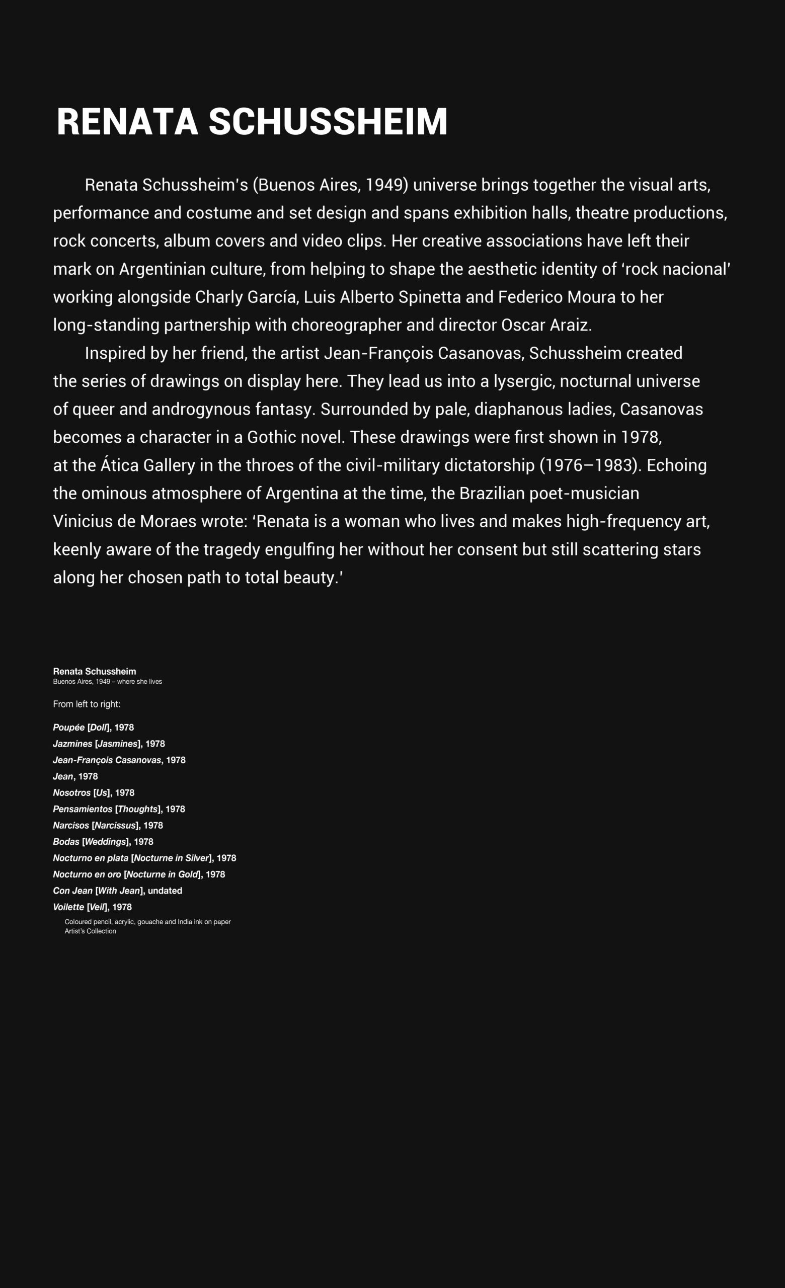 Inspired by her friend, the artist Jean-François Casanovas, Schussheim created the series of drawings on display here. They lead us into a lysergic, nocturnal universe of queer and androgynous fantasy. Surrounded by pale, diaphanous ladies, Casanovas becomes a character in a Gothic novel. These drawings were first shown in 1978, at the Ática Gallery in the throes of the civil-military dictatorship (1976–1983). Echoing the ominous atmosphere of Argentina at the time, the Brazilian poet-musician Vinicius de Moraes wrote: ‘Renata is a woman who lives and makes high-frequency art, keenly aware of the tragedy engulfing her without her consent but still scattering stars along her chosen path to total beauty.’