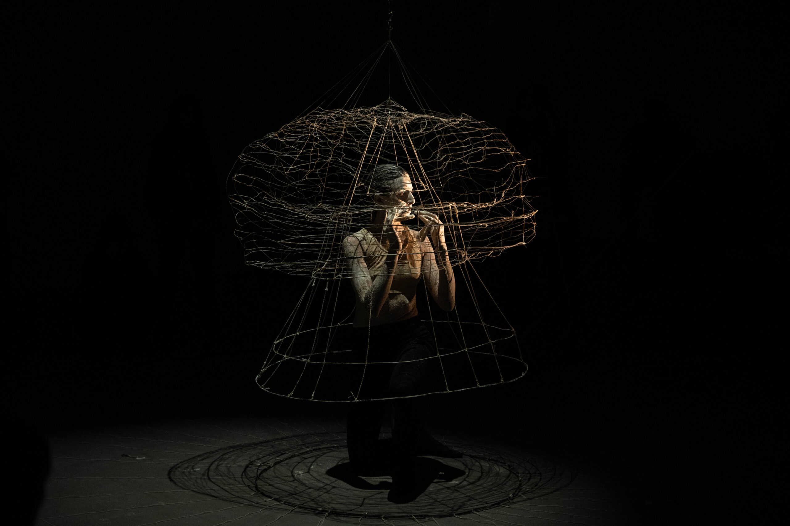 Una performance en blanco y negro. Una operaria con mameluco negro, una patinadora, una bailarina y fantasmas construyen cuadros vivos que se desplazan por el espacio oscuro de la sala, entre líneas blancas de alambre, manos alargadas y máscaras ambiguas. Esta investigación propone espacios invertidos, desplazamientos hacia atrás, caídas en diagonal, sonidos sugerentes con voces alteradas que transmiten un cuento imposible de contar. Una visión que despega del presente y se instala en la oscuridad de la ilusión.