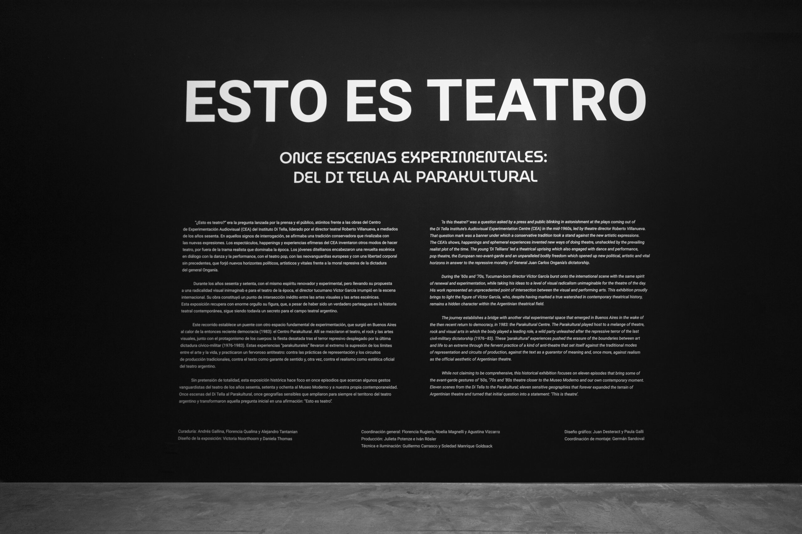 Sin pretensión de totalidad, esta exposición histórica hace foco en once episodios que acercan algunos gestos vanguardistas del teatro de los años sesenta, setenta y ochenta al Museo Moderno y a nuestra propia contemporaneidad. Once escenas del Di Tella al Parakultural, once geografías sensibles que ampliaron para siempre el territorio del teatro argentino y transformaron aquella pregunta inicial en una afirmación: “Esto es teatro”.