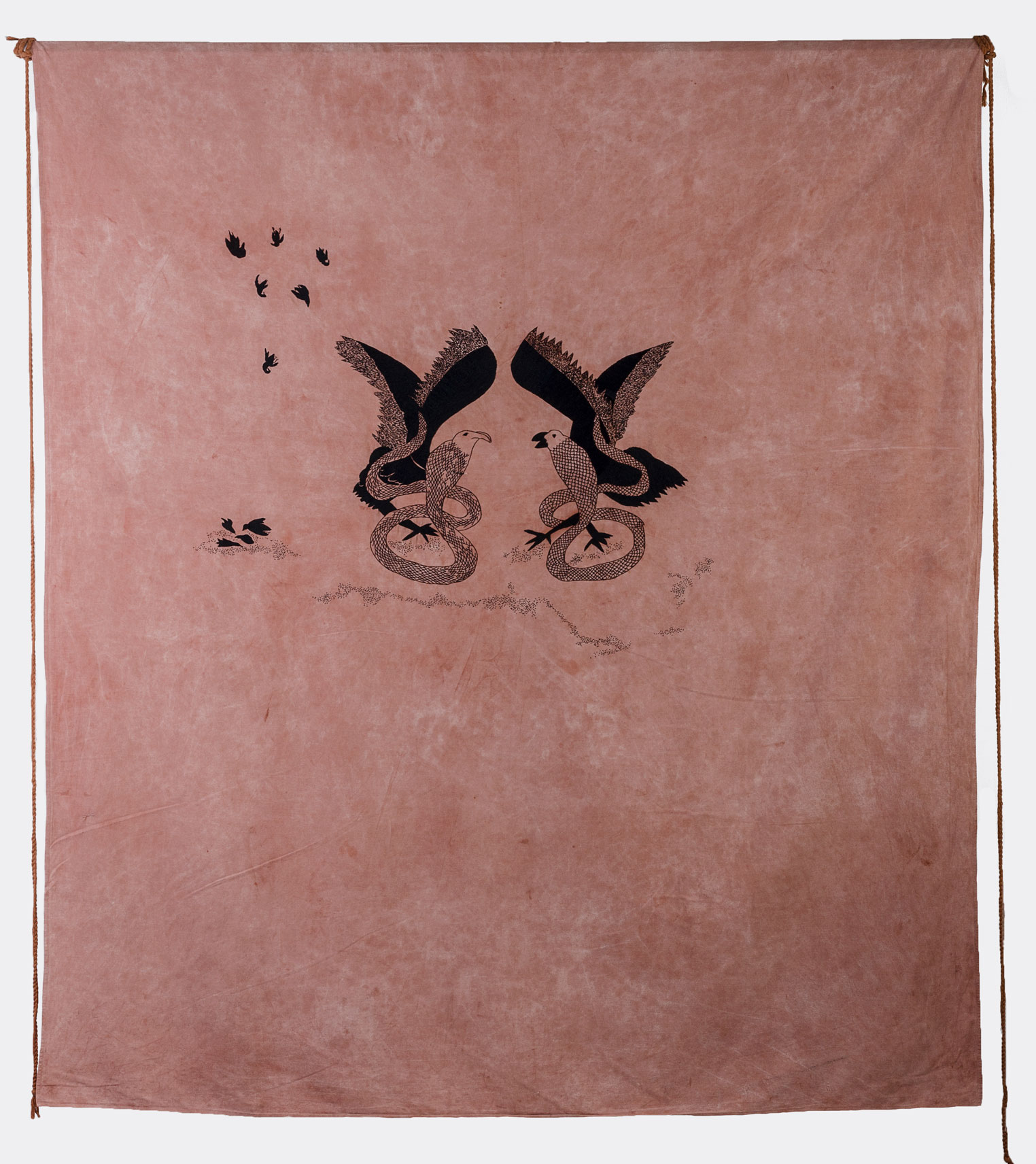 Arnaudo, Daniela, Sunchales, 1980. Detrás de los párpados, 2021. Bordado a mano con hilos de algodón sobre sábana antigua teñida con ferrite. Medidas: 175 x 200 cm, crédito: Carolina Setau.