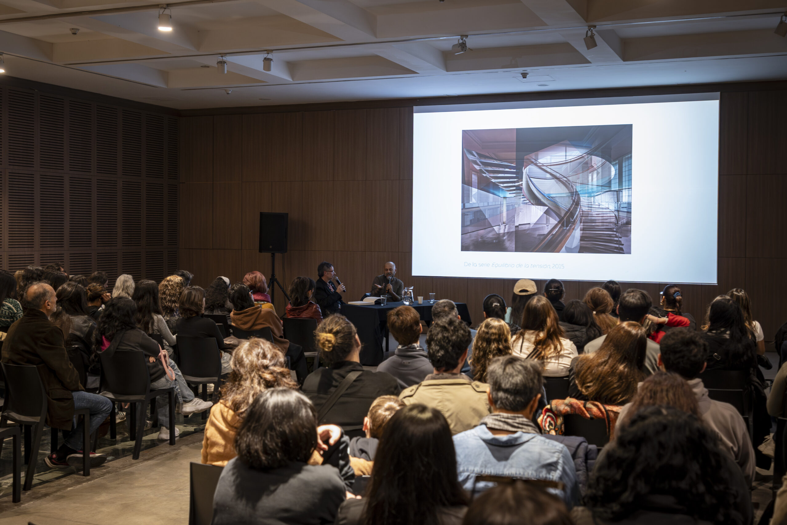 El sábado 24 de mayo, el artista Jorge Miño presentó El vientre del artista, una combinación de conferencia audiovisual y entrevista pública con la participación de Fernando García, curador de Programas Públicos del Museo de Arte Moderno de Buenos Aires. Ante un auditorio colmado, Miño explicó de qué manera nació y se desarrolló el trabajo que desembocó en La cuarta pared, su primera exposición individual en el Museo, con curaduría de Raúl Flores. Miño contó cómo un vuelo retrasado en el aeropuerto de Heathrow (Londres) terminaría convirtiéndose en una obsesión iconográfica: las escaleras. Entre la arquitectura y la fotografía, el artista encontró una estética propia que, en cada obra, termina de tomar forma en su laboratorio digital de posproducción. Durante la entrevista, se proyectaron imágenes de sus series desde 2011, en sintonía con obras de la vanguardia del siglo XX como Desnudo bajando una escalera (Marcel Duchamp) y Blanco sobre blanco (Kazimir Malevich).